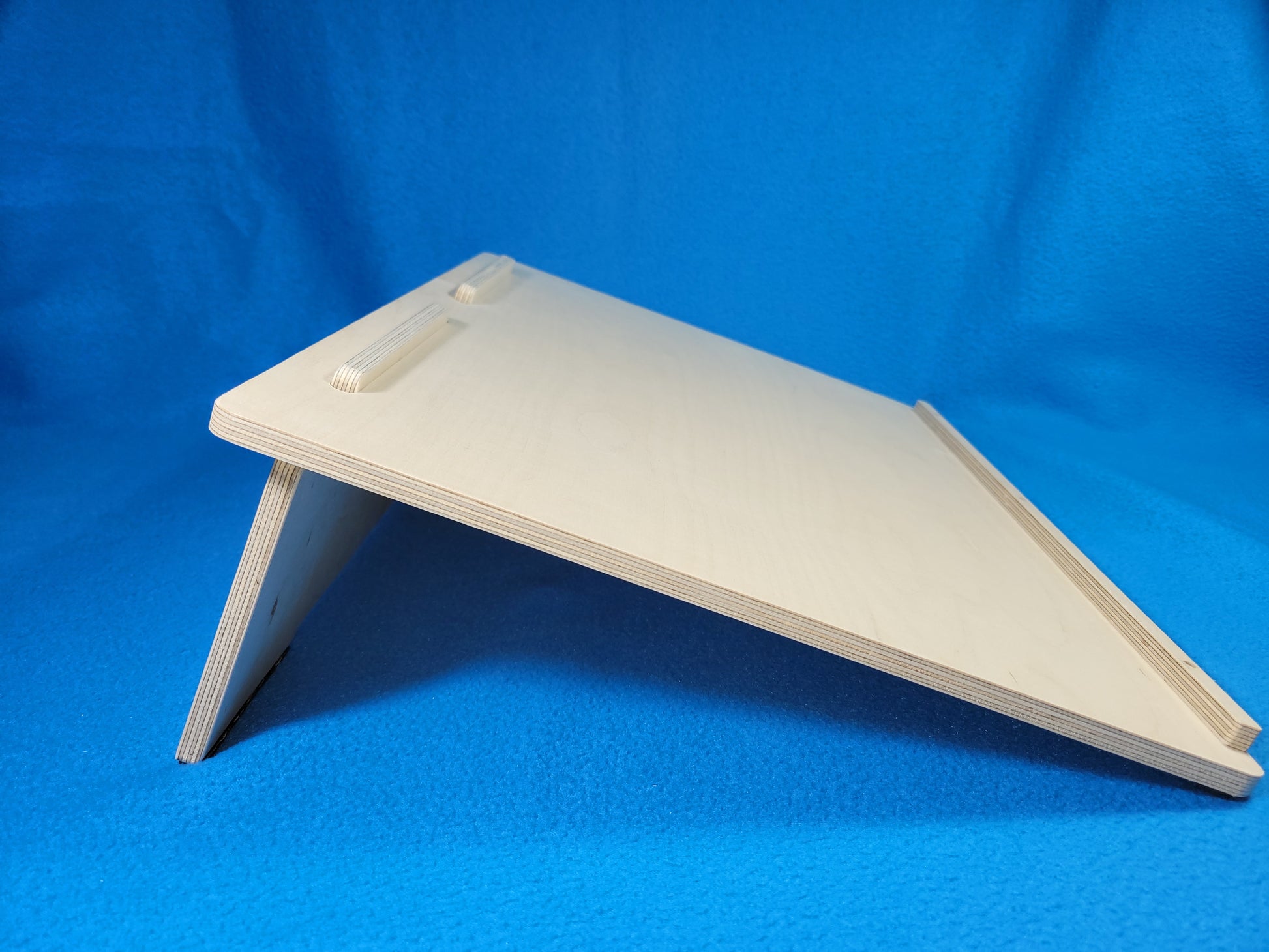 Gummibänder an den unteren Auflageflächen verhindern das Verrutschen des Pults auf der Unterlage. Die beiden Teile, aus denen das Pult besteht, sind ineinandergesteckt, damit ist das Pult auch sehr leicht wieder zerlegbar.